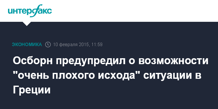 "Очевидно, что риски для мировой экономики, риски для британской экономики в связи с противостоянием между Грецией и еврозоной растут с каждым днем. Риск того, что просчеты или ошибки приведут к очень плохому исходу, также повышается", - заявил Осборн в интервью Bloomberg Television.