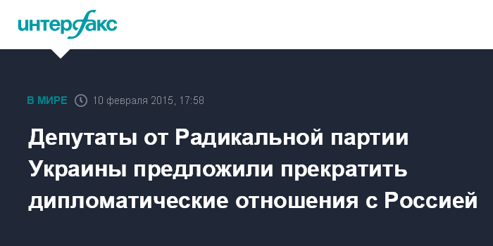 Москва. 10 февраля. INTERFAX.RU - Народные депутаты от фракции Радикальной партии Олега Ляшко предложили временно прекратить дипломатические отношения Украины с Российской Федерацией.
