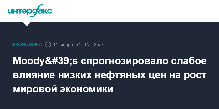 Москва. 11 февраля. INTERFAX.RU - Снижение цен на нефть, которое продолжится в течение некоторого времени, не окажет поддержки росту мировой экономики, прогнозирует рейтинговое агентство Moody's Investors Service.