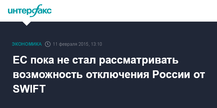 Москва. 11 февраля. INTERFAX.RU – Учреждения ЕС пока не предусматривают запрет использования SWIFT для России, заявил в среду журналистам высокопоставленный чиновник ЕС на условиях анонимности.