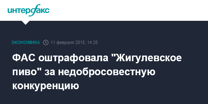 Москва. 11 февраля. INTERFAX.RU – Федеральная антимонопольная служба оштрафовала "Жигулевское пиво" и его генерального директора на 300 тыс. и 12 тыс. рублей соответственно за недобросовестную конкуренцию. Речь идет об использовании исключительных прав на комбинированный товарный знак со словом "Саяны".