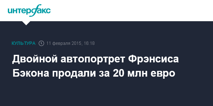 Москва. 11 февраля. INTERFAX.RU - Двойной автопортрет британского художника-экспрессиониста Фрэнсиса Бэкона продали на аукционе Sotheby's почти за 20 млн евро, сообщает The Irish Times.