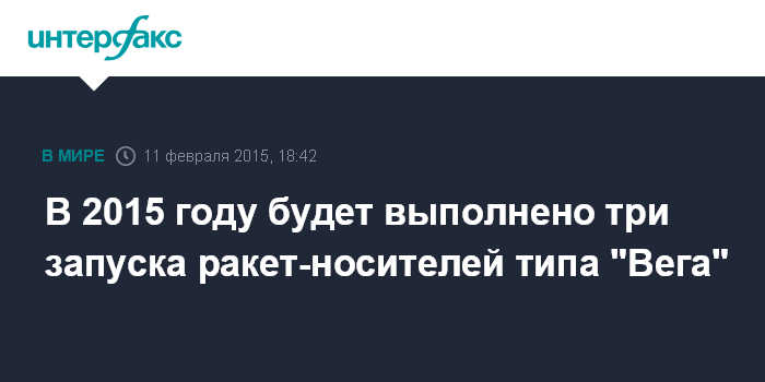 Москва. 11 февраля. INTERFAX.RU - В 2015 году с космодрома Куру во Французской Гвиане будет выполнена в общей сложности три запуска европейской ракеты-носителя легкого класса "Вега", сообщил в среду журналистам представитель Европейского космического агентства (ЕКА).