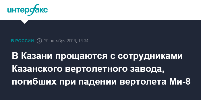 Москва. 29 октября. INTERFAX.RU - Более 1,5 тысяч человек пришли в среду проститься с четырьмя сотрудниками ОАО "Казанский вертолетный завод" (КВЗ), погибшими при крушении вертолета Ми-8 в минувшее воскресенье.