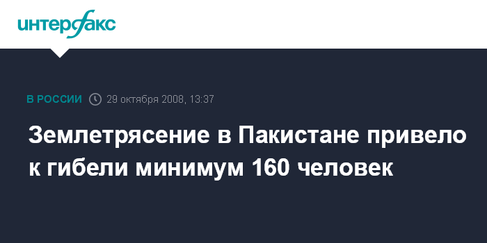 Москва. 29 октября. INTERFAX.RU - Не менее 160 человек погибли и 60 получили травмы в результате землетрясения силой в 6,4 балла по шкале Рихтера, произошедшего в среду на юго-западе Пакистана,