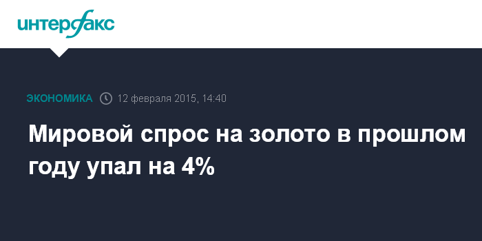 Москва. 12 февраля. INTERFAX.RU - Мировой спрос на золото в 2014 году в физическом выражении снизился на 4% по сравнению с 2013 годом и составил 3 тыс. 923,7 тонны, говорится в отчете World Gold Council. В денежном выражении потребление сократилось на 14%, до $159,754 млрд. Средняя цена снизилась на 10%, до $1266,4 за унцию.