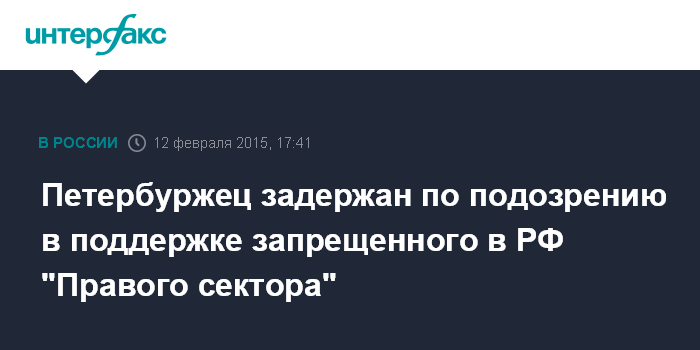 "12 февраля 2015 года задержан житель Санкт-Петербурга, подозреваемый в причастности к созданию в социальной сети "ВКонтакте" группы "Русский правый сектор", к распространению статей с призывами к осуществлению экстремистской деятельности, а также к публичной поддержке действий украинской экстремистской организации "Правый сектор", деятельность которой запрещена на территории России", - говорится в сообщении ФСБ.
