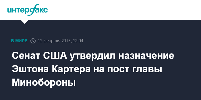 Москва. 12 февраля. INTERFAX.RU - Американские сенаторы проголосовали за назначение Эштона Картера на пост главы оборонного ведомства, сообщают в четверг американские СМИ.