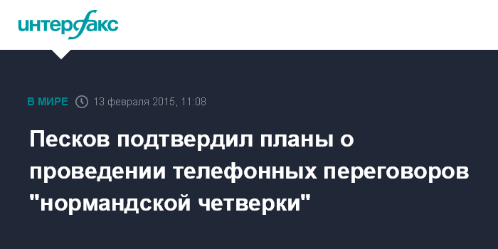На вопрос "Интерфакса", ожидается ли в ближайшие недели новый саммит "нормандской четверки", пресс-секретарь президента РФ отметил: "На данном этапе мы пока говорим о планирующемся телефонном разговоре".