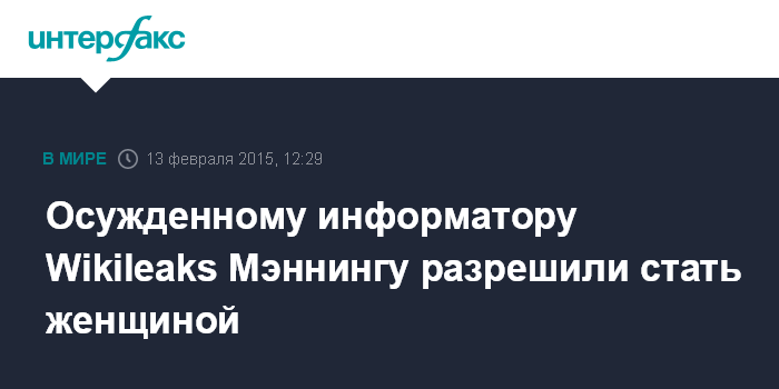 Москва. 13 февраля. INTERFAX.RU - Пентагон одобрил проведение гормональной терапии для бывшего информатора Wikileaks, американского рядового Брэдли Мэннинга, пожелавшего сменить пол и взявшего женское имя Челси.