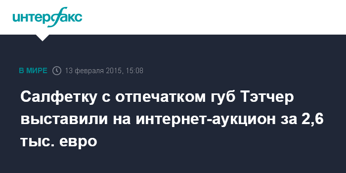 Москва. 13 февраля. INTERFAX.RU - Салфетку с отпечатком красной помады экс-премьера Великобритании Маргарет Тэтчер выставили на продажу в интернете. Такое предложение опубликовал интернет-аукцион Picollecta