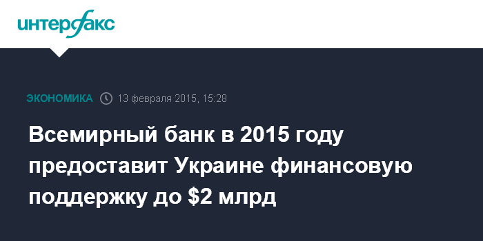 Москва. 13 февраля. INTERFAX.RU – Всемирный банк в 2015 году предоставит Украине до $2 млрд в рамках ряда инструментов финансовой поддержки, сообщила пресс-служба банка.