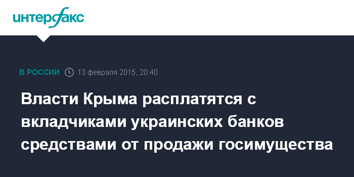 Москва. 13 февраля. INTERFAX.RU - Республика Крым может продать часть бывшего госимущества Украины, которое перешло в собственность региона после воссоединения Крыма с Россией, чтобы расплатиться с вкладчиками украинских банков, прекративших работать на полуострове, сообщил глава Республики Крым Сергей Аксенов.