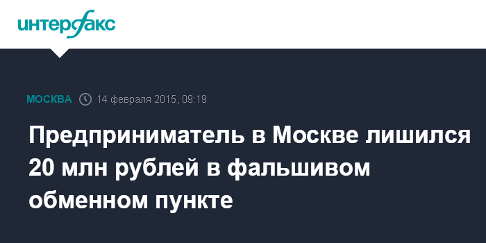 Москва. 14 февраля. INTERFAX.RU - Частный предприниматель лишился почти 20 млн рублей в фальшивом пункте обмена валют на северо-востоке столицы, сообщили "Интерфаксу" в пресс-службе московской полиции.