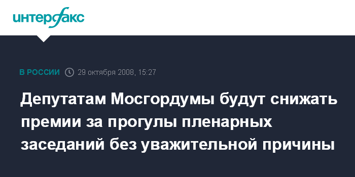 Москва. 29 октября. INTERFAX.RU - Депутатам Мосгордумы будут снижать премии за прогулы пленарных заседаний без уважительной причины, сообщил в среду журналистам председатель думы Владимир Платонов.