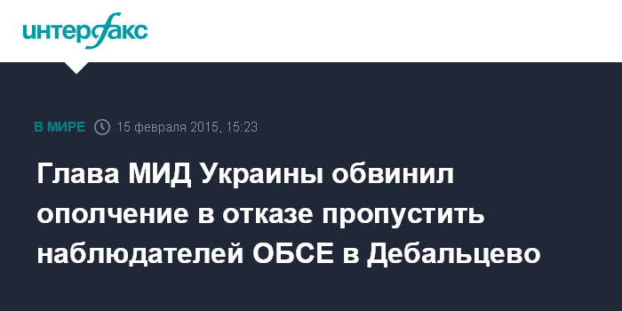 Москва. 15 февраля. INTERFAX.RU - Представители ополчения самопровозглашенной ДНР в воскресенье не пропустили наблюдателей Специальной мониторинговой миссии (СММ) ОБСЕ в Дебальцево Донецкой области, заявил министр иностранных дел Украины Павел Климкин.