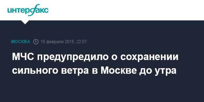 Москва. 15 февраля. INTERFAX.RU - Сильный ветер с порывами 15 метров в секунду и выше сохранится в Москве до утра, сообщили "Интерфаксу" в воскресенье в пресс-службе столичного ГУ МЧС РФ.