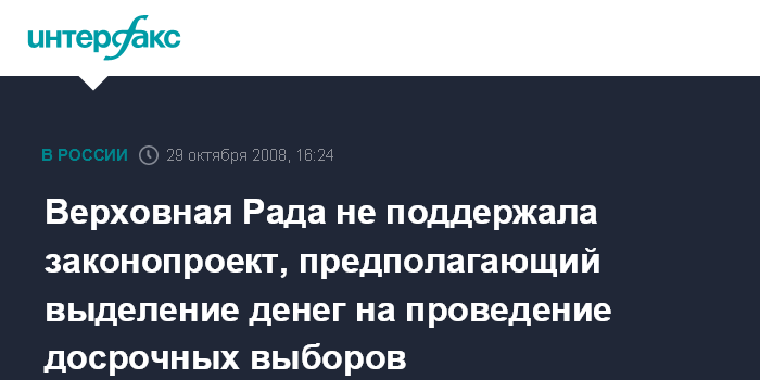 Москва. 29 октября. INTERFAX.RU - Верховная Рада в среду не поддержала законопроект депутата от НУ-НС Ксении Ляпиной, предусматривающий меры по преодолению финансового кризиса и финансированию внеочередных парламентских выборов.