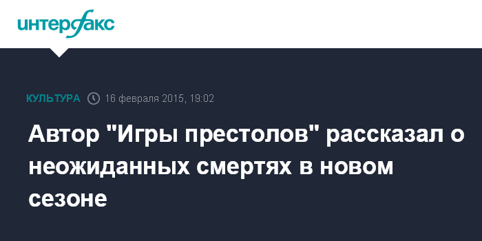 Москва. 16 февраля. INTERFAX.RU - Джордж Р.Р. Мартин, автор серии романов "Песнь льда и огня", по которой поставлен сериал "Игра престолов", в интервью сайту Showbiz411 заявил, что в пятом сезоне погибнут некоторые из персонажей, которые остаются в живых в книге.