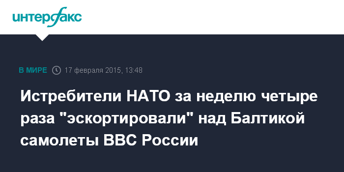Москва. 17 февраля. INTERFAX.RU - Истребители НАТО, патрулирующие воздушное пространство стран Балтии, на прошлой неделе четыре раза сопровождали российские самолеты, находящиеся в зоне реагирования миссии ПВО НАТО, сообщило во вторник Минобороны Литвы.