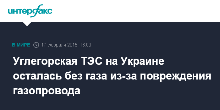 Москва. 17 февраля. INTERFAX.RU - Углегорская ТЭС, а также ряд других потребителей Донецкой области остались без газоснабжения из-за повреждения трубопровода - отвода от магистральной ветки "Новопсков-Краматорск", сообщает пресс-служба ПАО "Укртрансгаз".