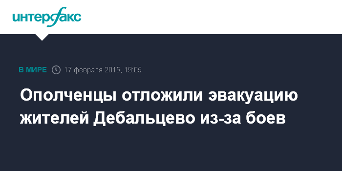 Москва. 17 февраля. INTERFAX.RU - Эвакуацию мирных жителей из Дебальцево перенесли на 18 февраля из-за боевых действий, сообщает во вторник Донецкое агентство новостей со ссылкой на Министерство транспорта самопровозглашенной Донецкой народной республики.