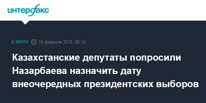 Москва. 18 февраля. INTERFAX.RU - Мажилис (нижняя палата парламента) Казахстана обратился к главе государства Нурсултана Назарбаева с призывом назначить дату внеочередных выборов президента страны.