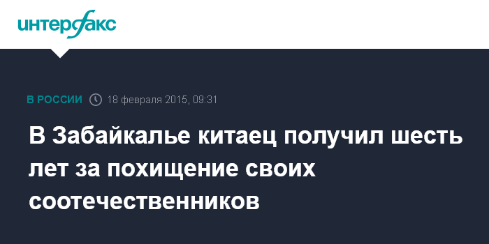 Москва. 18 февраля. INTERFAX.RU - Суд в Забайкальском крае приговорил к шести годам колонии особого режима 42-летнего гражданина Китая Чэ Вэнь Сюе по делу о похищении людей, сообщает пресс-служба краевого СУ СКР.