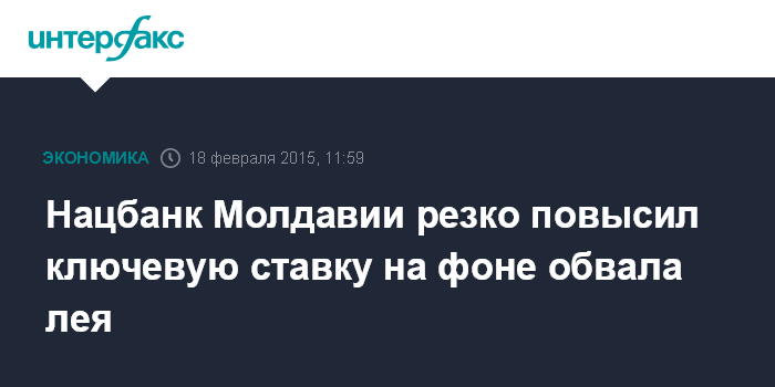 Москва. 18 февраля. INTERFAX.RU – Национальный банк Молдавии (НБМ) резко повысил базисную процентную ставку по краткосрочным операциям - до 13,5% с 8,5% годовых на фоне обвального падения курса нацвалюты - лея - к доллару США.