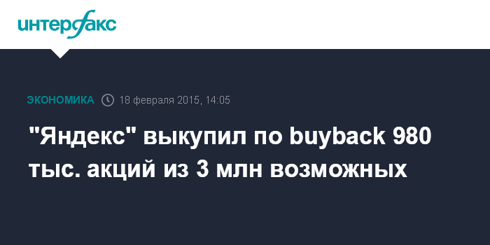 Москва. 18 февраля. INTERFAX.RU - "Яндекс" выкупил 980 тыс. акций класса "А" в рамках программы buyback с лимитом в 3 млн бумаг, говорится в сообщении компании.