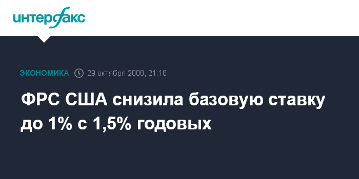 Москва. 29 октября. INTERFAX.RU - Федеральная резервная система (ФРС) США в среду приняла решение о снижении базовой процентной ставки "овернайт" до 1% с 1,5% годовых, как и ожидало большинство аналитиков, сообщило агентство Bloomberg.