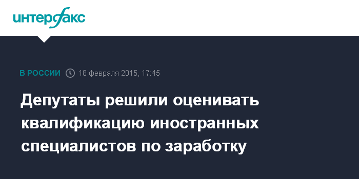Москва. 18 февраля. INTERFAX.RU - Госдума в среду приняла в первом чтении законопроект, устанавливающий в качестве критерия высококвалифицированного иностранного специалиста его месячный заработок.