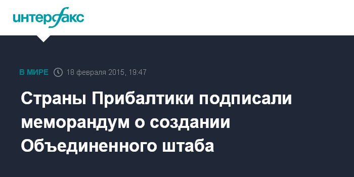 Москва. 18 февраля. INTERFAX.RU - Министры обороны стран Балтии подписали согласительный меморандум о создании элемента Объединенного штаба Балтийских государств, сообщили BNS в министерстве обороны Латвии. Во время проходящего в Риге неформального совещания министров обороны стран-участниц ЕС меморандум подписали министры обороны Латвии, Литвы и Эстонии Раймонд Вейонис, Юозас Олякас и Свен Миксер.