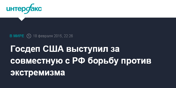 Москва. 18 февраля. INTERFAX.RU - Россия и США продолжают сотрудничать в том, что касается борьбы против экстремизма, и потому в Вашингтоне приветствуют решение Москвы принять участие на этой неделе в Вашингтоне в саммите по противодействию насильственному экстремизму, заявила представитель госдепа Джен Псаки.