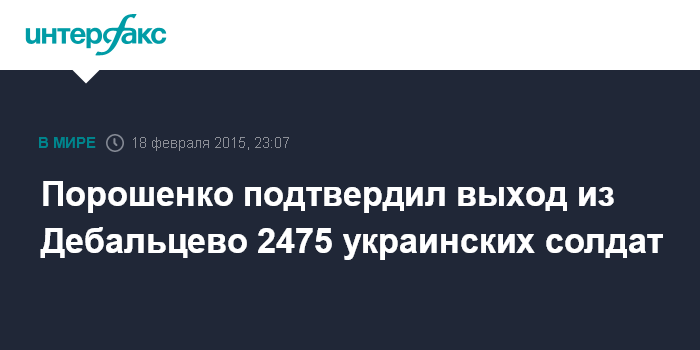 Москва. 18 февраля. INTERFAX.RU - Президент Украины Петр Порошенко заявляет, что из Дебальцево были выведены всего 2475 военнослужащих.