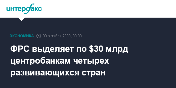 Вашингтон. 30 октября. INTERFAX.RU - Федеральная резервная система (ФРС) выделяет по $30 млрд центральным банкам Бразилии, Мексики, Южной Кореи, Сингапура, чтобы поддержать переживающие кризис кредитные рынки развивающихся стран.