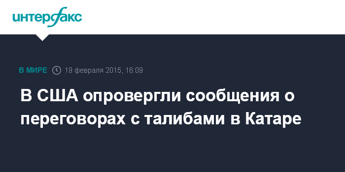 Москва. 19 февраля. INTERFAX.RU - Представитель американских властей опроверг информацию о проведении мирных переговоров с талибами в Катаре, сообщают в четверг западные СМИ.