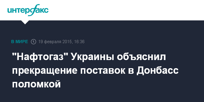 Москва. 19 февраля. INTERFAX.RU - Поставки газа в зону проведения войсковой операции на юго-востоке Украины прекратились из-за критических повреждений газотранспортной инфраструктуры, которые были нанесены в ходе боевых действий, сообщила в четверг пресс-служба НАК "Нафтогаз Украины".