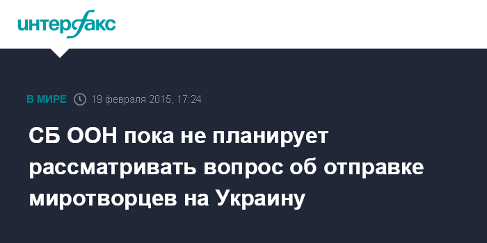 Москва. 19 февраля. INTERFAX.RU -- Вопрос об отправке миротворческих сил на восток Украины не стоит в повестке дня Совета безопасности ООН, заявил "Интерфаксу" в четверг заместитель министра иностранных дел России Геннадий Гатилов.