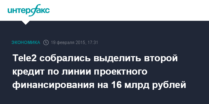Tele2 собрались выделить второй кредит по линии проектного финансирования на 16 млрд рублей
