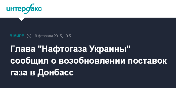 Москва. 19 февраля. INTERFAX.RU - Поставки природного газа в зону войсковой операции на востоке Украины возобновлены, сообщил глава правления НАК "Нафтогаз Украины" Андрей Коболев на пресс-конференции в Киеве в четверг.
