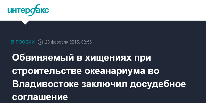 Москва. 20 февраля. INTERFAX.RU - Гендиректор ООО "НПО "Мостовик" Олег Шишов признал свою причастность к хищениям 1,9 млрд руб. при строительстве океанариума во Владивостоке, заключив досудебное соглашение о сотрудничестве с Генпрокуратурой, сообщила газета "Коммерсант" в пятницу.