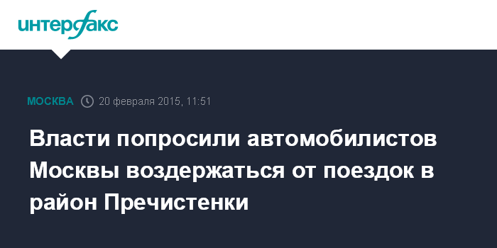 Москва. 20 февраля. INTERFAX.RU - Движение наземного транспорта по улице Пречистенка в столице временно затруднено, и департамента транспорта Москвы просит автомобилистов воздержаться от поездок в этот район.