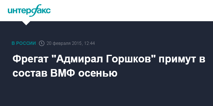 Москва. 20 февраля. INTERFAX.RU - Головной фрегат проекта 22350 "Адмирал Горшков" планируется принять в состав ВМФ России осенью 2015 года, сообщил главнокомандующий ВМФ Виктор Чирков журналистам в пятницу в Петербурге.