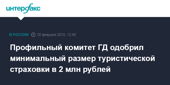 Москва. 20 февраля. INTERFAX.RU - Комитет Госдумы по финансовому рынку на заседании в пятницу рекомендовал нижней палате парламента принять в первом чтении правительственный законопроект, который фиксирует минимальную страховую сумму по полисам выезжающих за рубеж на уровне 2 млн рублей.