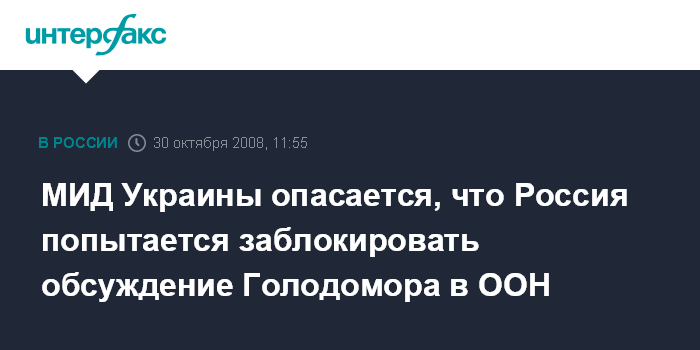 Постоянный представитель России при ООН Чуркин на пресс-конференции в Нью-Йорке 28 октября заявил, что "Киев, настойчиво добиваясь обсуждений вопроса голодомора в ООН и признания его геноцидом, пытается отвлечь внимание украинцев от истинных экономических и политических проблем в своей стране".