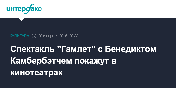 Москва. 20 февраля. INTERFAX.RU - Постановку "Гамлета" в лондонском театре Barbican с Бенедиктом Камбербэтчем в главной роли будут транслировать в кинотеатрах, сообщает The Stage.