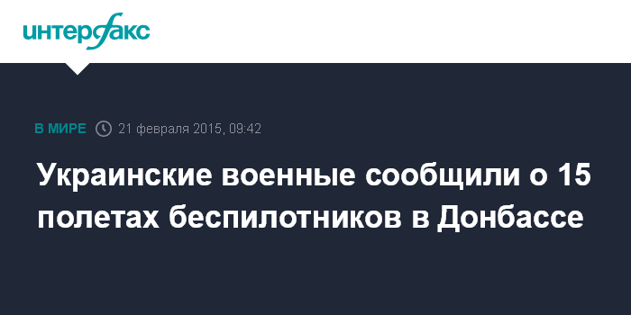 Москва. 21 февраля. INTERFAX.RU - За минувшие сутки в зоне проведения силовой операции зафиксировано 15 случаев ведения воздушной разведки с помощью беспилотных летательных аппаратов (БПЛА) со стороны противника, сообщает представитель штаба украинской военной операции в Донбассе Анатолий Стельмах.