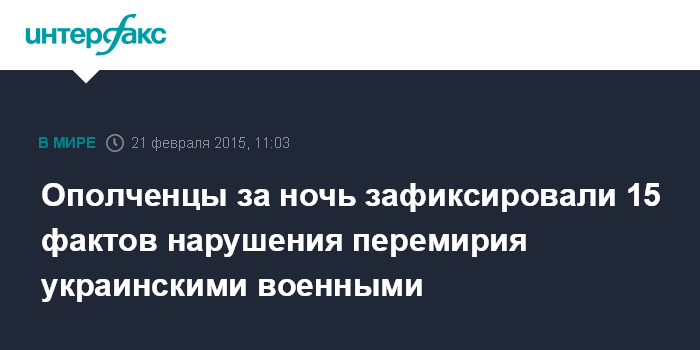 Москва. 21 февраля. INTERFAX.RU - Украинские военные минувшей ночью нарушили режим прекращения огня 15 раз, заявляют в минобороны самопровозглашенной Донецкой народной республики.