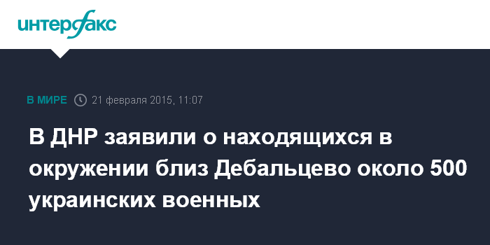 Москва. 21 февраля. INTERFAX.RU - В минобороны самопровозглашенной Донецкой народной республики сообщили, что в дебальцевском "котле" находятся до 500 украинских военных.